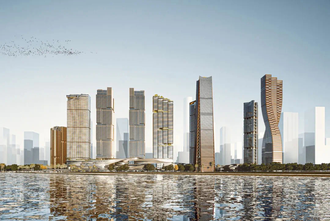 前海國際樞紐中心項目位于前海CBD桂灣片區(qū)的核心位置,作為深圳在建規(guī)模超大的樞紐TOD工程之一,用地面積達(dá)20公頃,未來將打造成集綜合交通樞紐、立體商業(yè)、甲級辦公、國際星級酒店、商務(wù)公寓于一體的超級樞紐城市綜合體。樞紐項目上蓋有9棟超高層建筑,其中T2為商務(wù)公寓,建筑高度約250米。T3和T4為雙子塔超甲級寫字樓,建筑高度近300米,其變化豐富的立面打造出獨(dú)特的綜合體建筑形象,因緊鄰前海灣,T3、T4寫字樓造型上還具有“水石相間”的含義,兩棟對稱的塔樓將成為該項目的亮點(diǎn)封面之一。