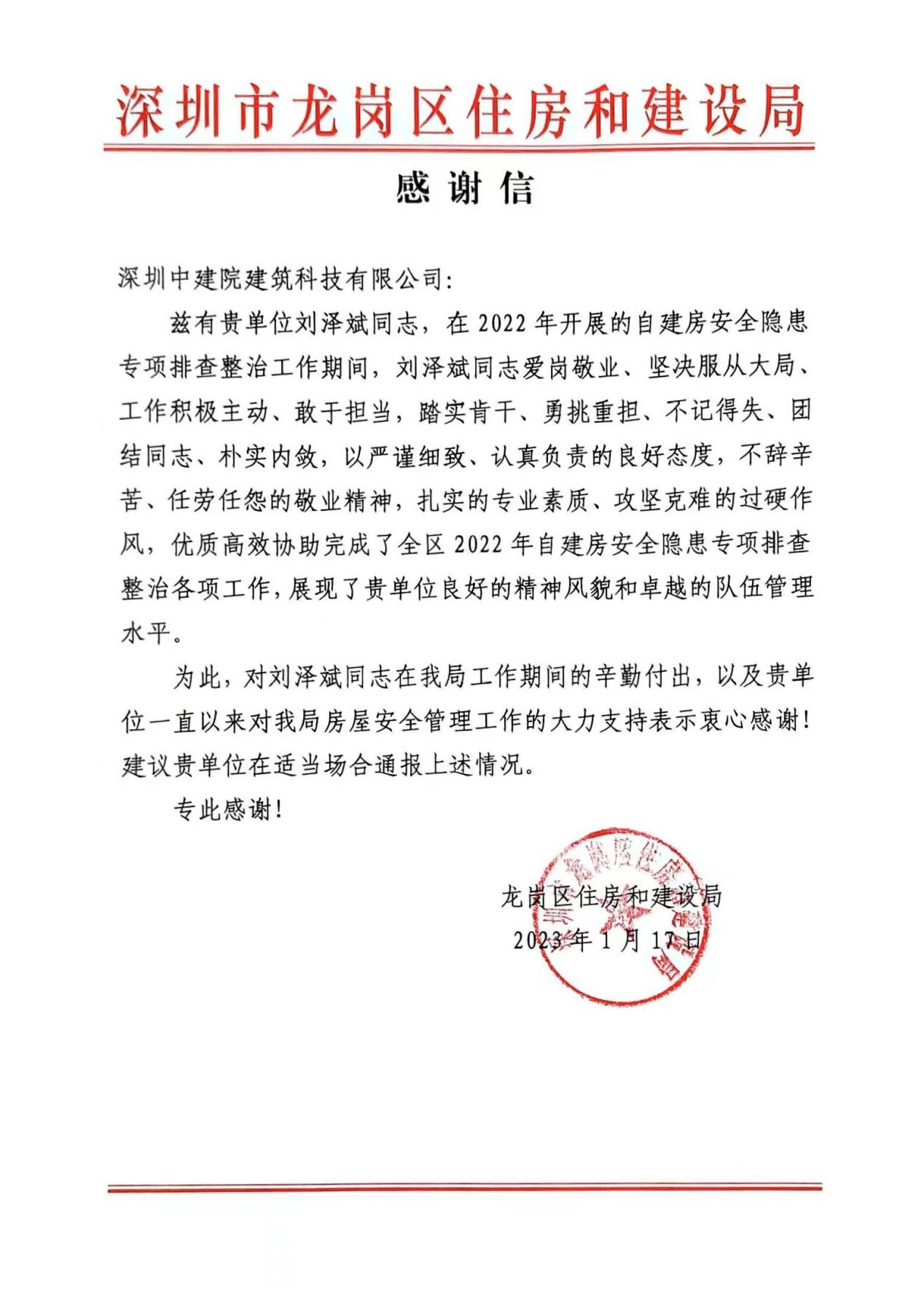 近期,深圳中建院建筑科技有限公司(以下簡(jiǎn)稱“深圳中建院”)收到深圳市龍崗區(qū)住房和建設(shè)局發(fā)來(lái)的感謝信,對(duì)深圳中建院及劉澤斌同志在2022年度開(kāi)展的自建房安全隱患專項(xiàng)排查整治工作中的辛勤付出和大力支持表示誠(chéng)摯的謝意。