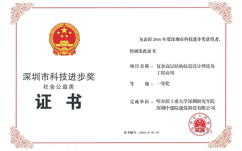 2017年 9月21日下午,深圳召開全市科學(xué)技術(shù)獎(jiǎng)勵(lì)大會(huì),市長(zhǎng)陳如桂主持大會(huì),省委常委、市委書記王偉中出席大會(huì)并講話,副市長(zhǎng)艾學(xué)峰通報(bào)全市創(chuàng)新驅(qū)動(dòng)發(fā)展情況,并宣讀關(guān)于頒發(fā)2016年度深圳市科學(xué)技術(shù)獎(jiǎng)的通報(bào)。其中,以哈爾濱工業(yè)大學(xué)(下稱哈工大)滕軍教授和我院深圳中建院建筑科技有限公司(下稱中建院)何春凱研究員等作為主要參與人,哈工大和中建院共同完成的課題《復(fù)雜高層結(jié)構(gòu)抗震設(shè)計(jì)理論及工程應(yīng)用》榮獲2016年度深圳市科技進(jìn)步獎(jiǎng)一等獎(jiǎng)。