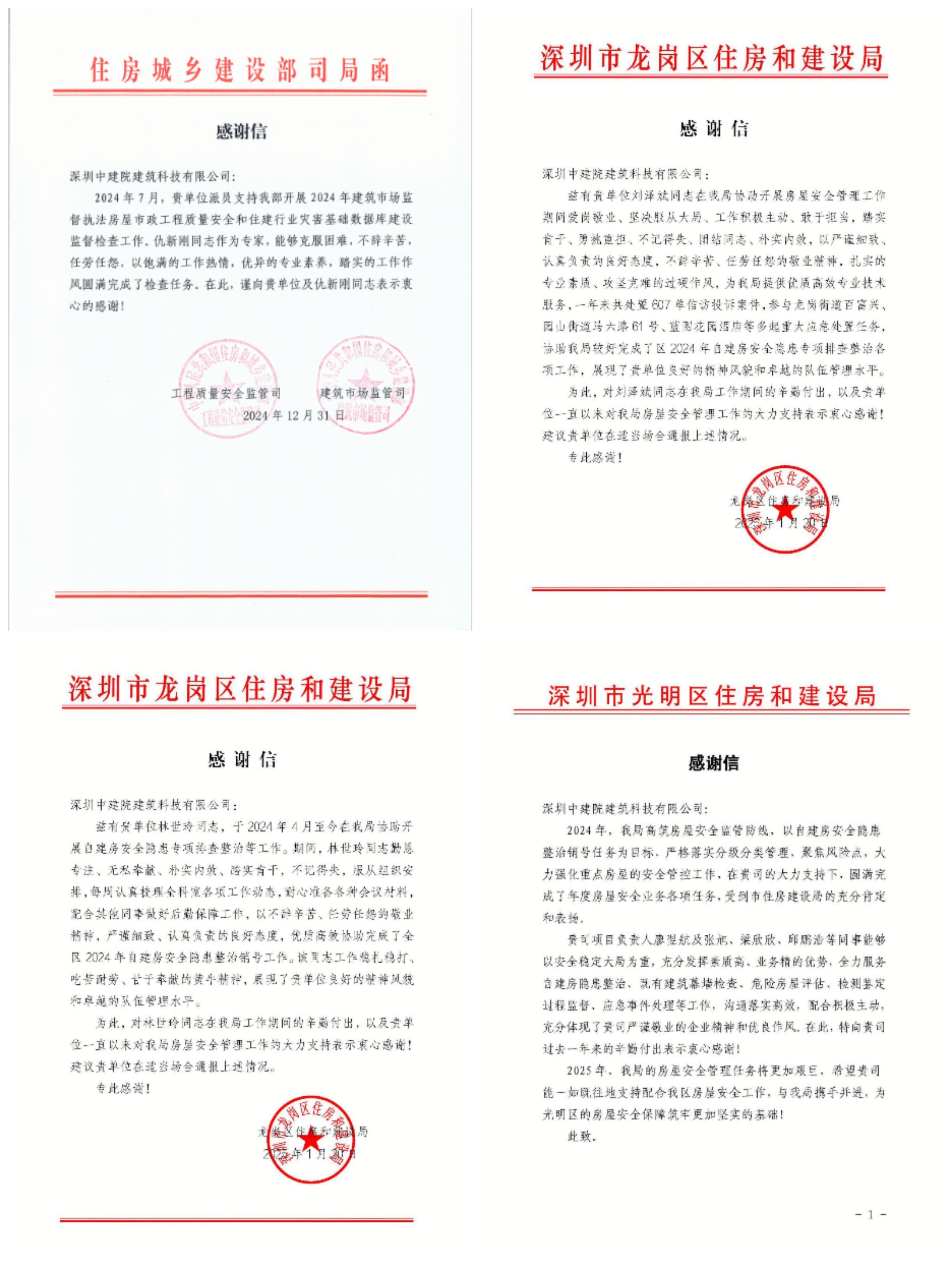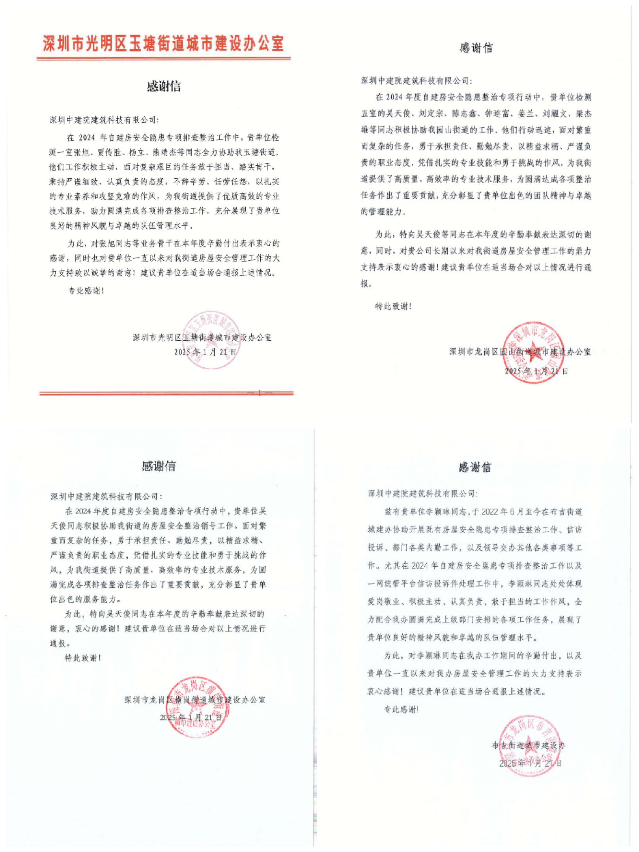 ?近日,中國建研院深圳分公司所屬深圳中建院陸續(xù)收到多封沉甸甸的感謝信——來自住房城鄉(xiāng)建設(shè)部工程質(zhì)量安全監(jiān)管司、建筑市場監(jiān)督司,深圳市光明區(qū)住房和建設(shè)局、龍崗區(qū)住房和建設(shè)局,及玉塘街道、園山街道、橫崗街道、布吉街道、平湖街道、新橋街道等政府部門。信中向深圳中建院在2024年建筑市場監(jiān)督執(zhí)法房屋市政工程質(zhì)量安全、住建行業(yè)災害基礎(chǔ)數(shù)據(jù)庫建設(shè)監(jiān)督檢查工作中所作出的貢獻,以及多年來對深圳市區(qū)住建部門、街道等轄區(qū)主管部門在房屋安全管理工作的默默付出表示感謝。